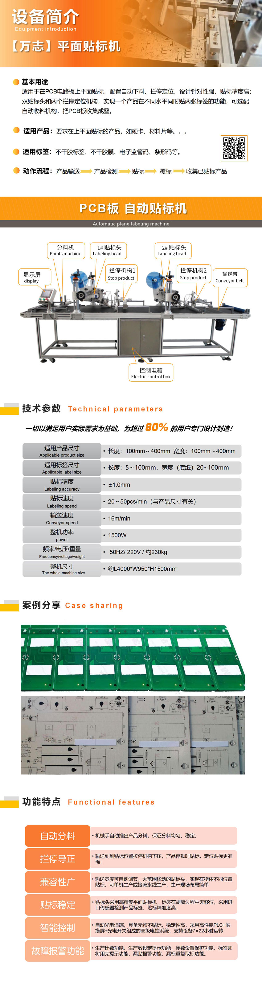 適(shì)用於在PCB電路(lù)板上平麵(miàn)貼標,配置自動上料、攔停定位貼標精度高。雙貼標頭和兩個攔停定位機構,實現一個(gè)產品在不同水(shuǐ)平同時貼兩張標簽的(de)功能;可選配自動收(shōu)料機構,把PCB板收集成疊。