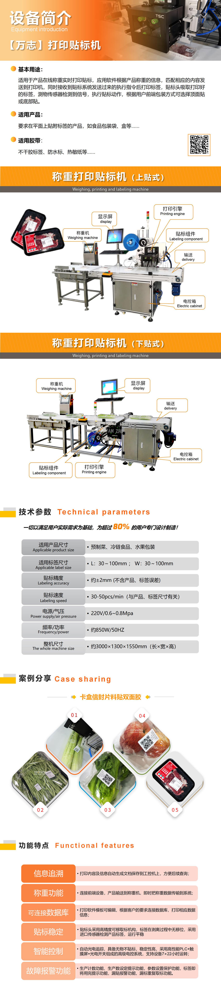 一、基本用途:適用於產品表麵在線稱重實時打印(yìn)貼標,采用先進無接觸吹(chuī)貼式貼標,適應於不同高(gāo)度(厚度)的包裝盒/袋自動貼標。打印係統(tǒng)對接數據庫,對流水線上的產(chǎn)品進行貼標;前端可連接包(bāo)裝機、包膜機,實現流水線無人(rén)化作業;