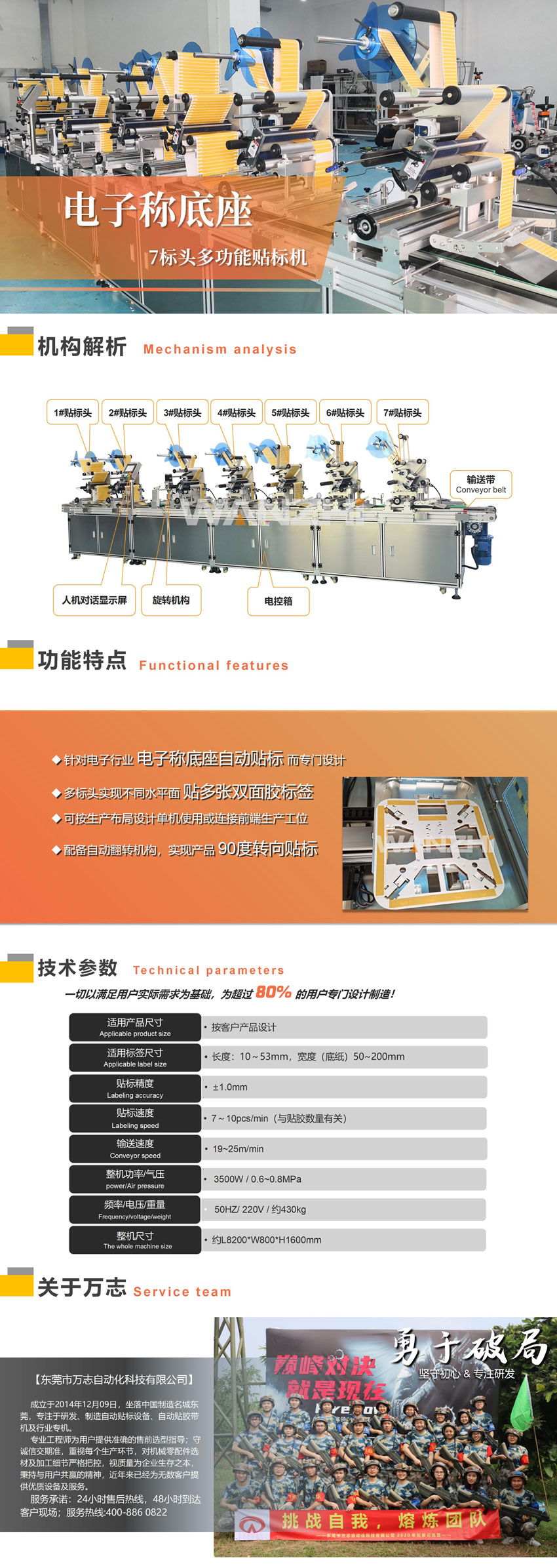 專用於電子(zǐ)稱底座表麵(miàn)貼標/3M膠標簽,配置7個標頭,含自動旋轉角度功能實(shí)現在不同位置貼多條膠的功能;