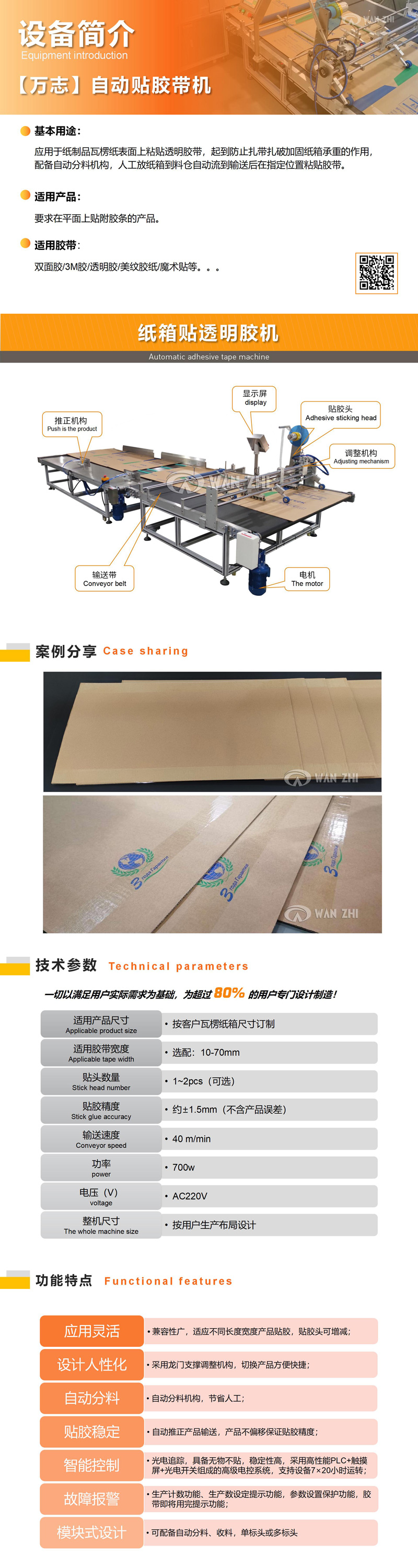 應用(yòng)於紙製品瓦楞紙表(biǎo)麵上(shàng)粘貼透明膠(jiāo)帶,起到防止紮帶紮(zhā)破加固(gù)紙箱承重(chóng)的作用,可配備自動分料機構,人(rén)工放紙箱到料倉自動流(liú)到輸送後在指定位置粘貼膠帶。適用於在各種(zhǒng)物品的上平麵粘雙麵膠/3M膠,根據貼膠(jiāo)長度要求自動(dòng)裁切;如海(hǎi)報(bào)、紙卡、盒子、袋子等;可結合產(chǎn)品考慮選配自動送料機構,自動收料機構(gòu)等 ,取代人工(gōng)更高效。