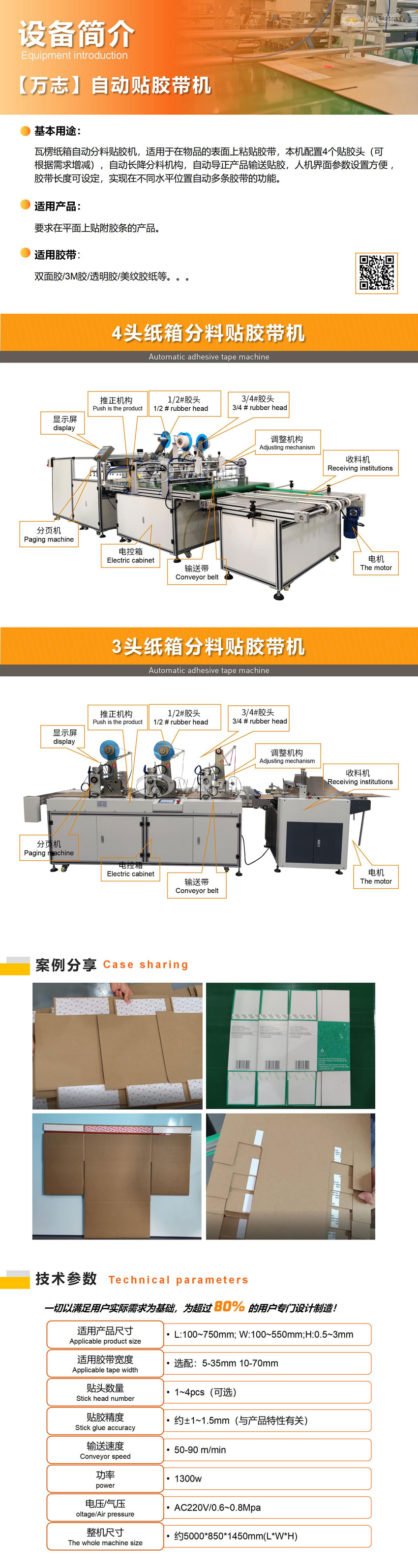全自動(dòng)紙箱貼(tiē)雙(shuāng)麵膠/透明膠機本機型(xíng)主要用於各類紙箱、紙卡等印刷品表麵自動切斷、粘貼雙麵膠帶或透明膠帶。配置2個(gè)貼膠頭(tóu),實(shí)現輸(shū)送方向同時貼2條膠帶,貼合長(zhǎng)度可任意設定;貼膠頭可根據用(yòng)戶需求選配;設備可選自動分料(liào)/收料機構,工作效率約50-90 m/min(效率(lǜ)與產(chǎn)品尺寸有(yǒu)關);