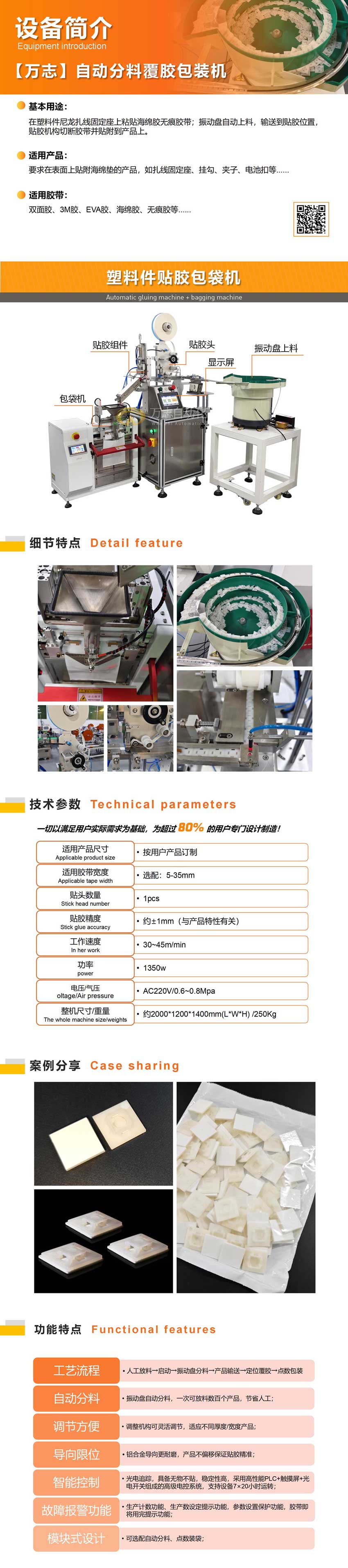 在塑料件尼龍紮(zhā)線固(gù)定座上粘貼(tiē)海綿膠無痕膠帶;振動盤自動上料,輸送到貼(tiē)膠位置,貼膠機構切(qiē)斷膠帶並貼附到產品上。
