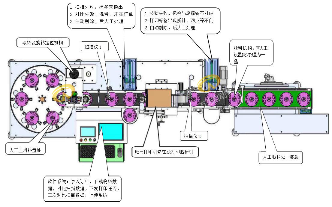 工位說明:1.判斷條件,讀取(qǔ)條碼不成功,物料混料,料盤不在當前設備的訂單(dān)中等
