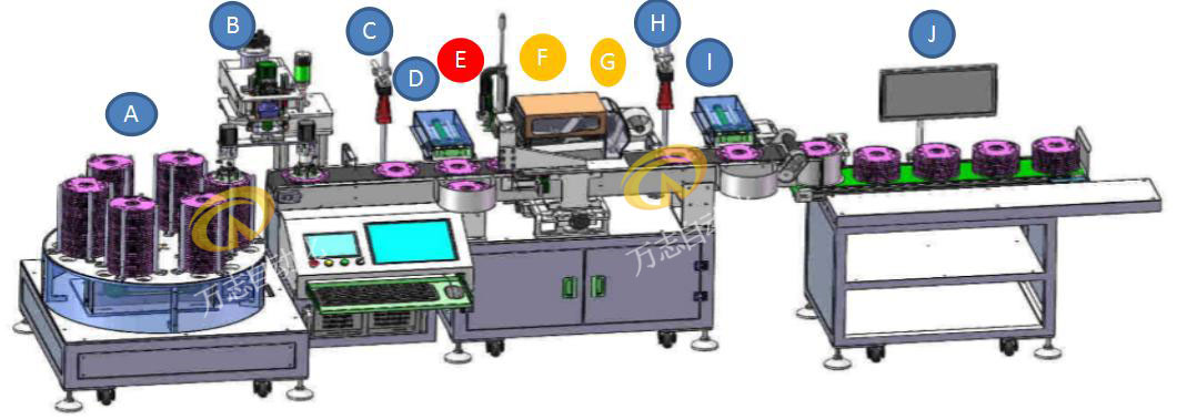 工位說明:1.接收上位軟件下發的打印任務,(可列隊),打印標簽真空(kōng)吸住,等待料盤過來(一般掃描工位到貼標工位,會預留兩(liǎng)個產品,所以打印貼標機自動列隊(duì))