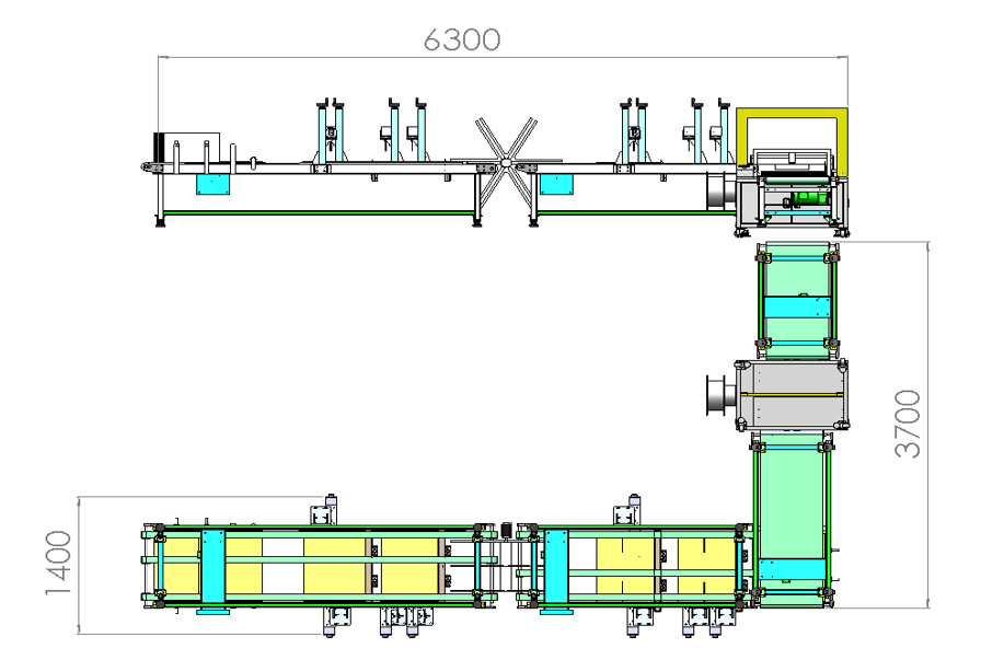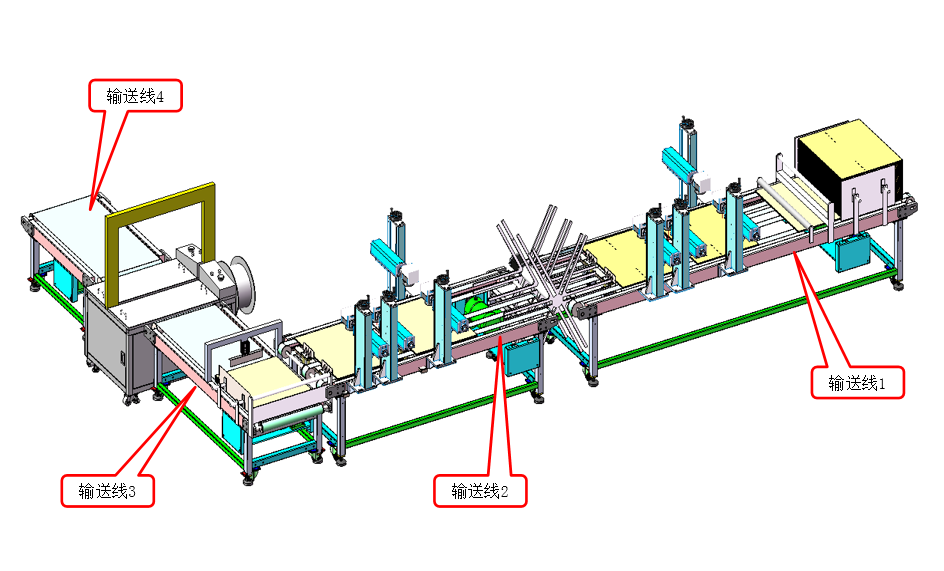 7.折疊好的產品流入打包機,打包機將產品進行打包紮帶,兩(liǎng)條紮帶打包完成後產品繼續流入下(xià)一工位以上(shàng)為完整作業流程,產線(xiàn)按此循環動(dòng)作