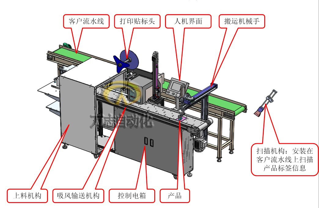 3.掃描槍掃描信息(xī)並傳回電腦,打印機打印(yìn)標簽,吸頭吸(xī)取標簽;傳感(gǎn)器檢測到產品到達貼(tiē)標位,貼標機(jī)械手進行貼標