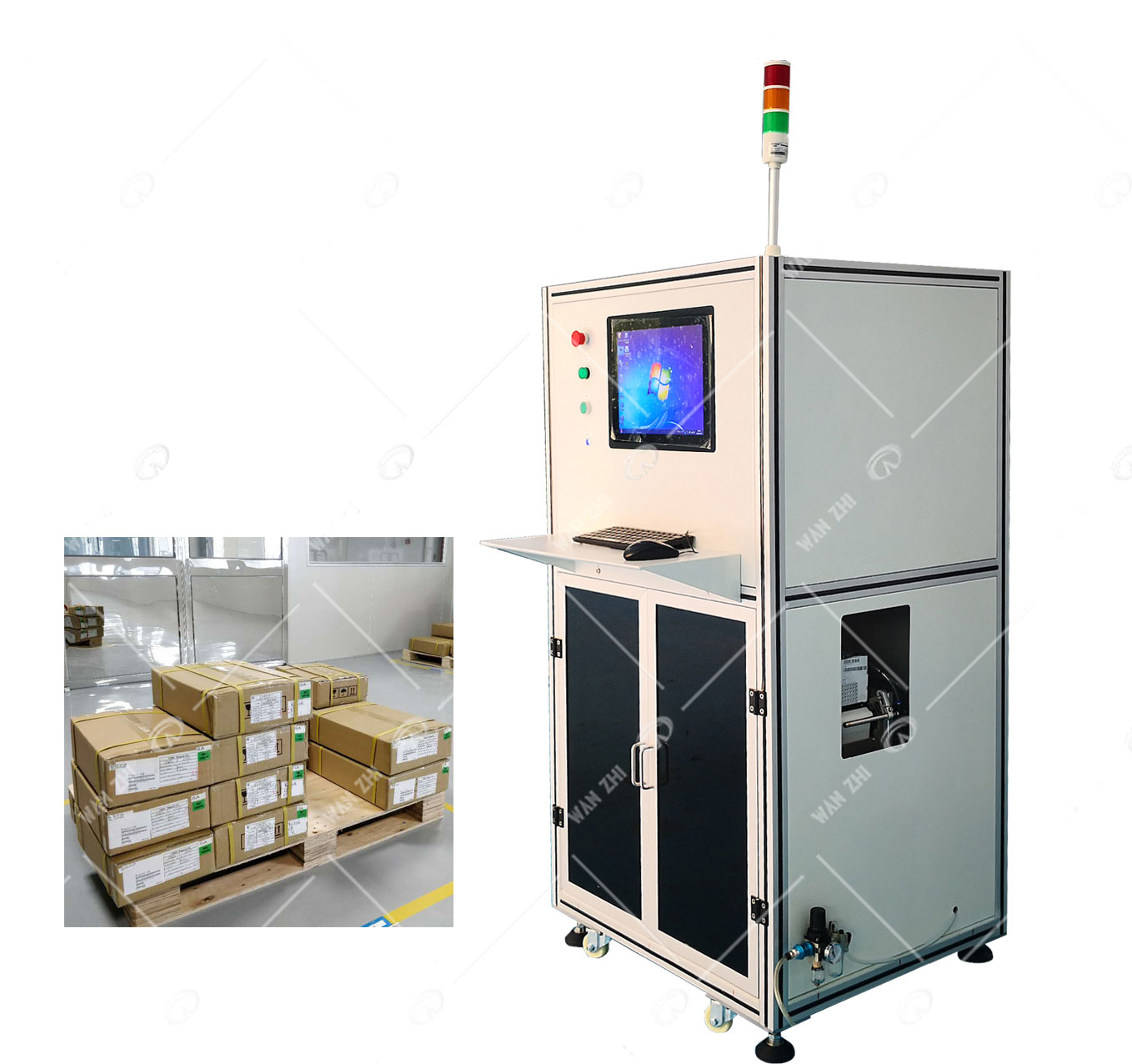 適用於產品或包裝外(wài)箱等(děng)側麵或頂麵打印(yìn)貼標。打印係統對接ERP係統,采集相應數據打印標簽,針對(duì)不同型號的產品進行標簽貼標。