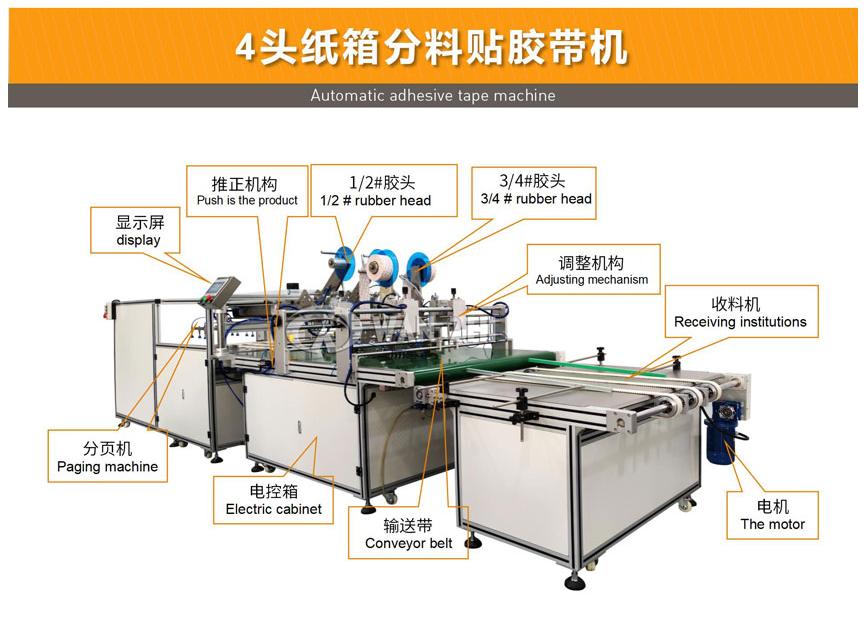 可(kě)配置2-4個貼膠頭,實現輸送方(fāng)向同時貼2條(tiáo)膠帶,貼合(hé)長度可(kě)任意設(shè)定;貼膠(jiāo)頭可根據用戶需求(qiú)選(xuǎn)配;設備可選自動分料/收料機構,工作效率約50-90m/min(效率與產品尺寸有關);